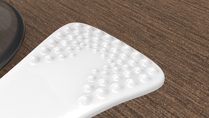 Belugas Griff und Mundstück ist von einem Relief Muster übersehen, um das sensorische Erlebnis des Benutzers während dem Verspeisen der Nahrung zu verbessern.