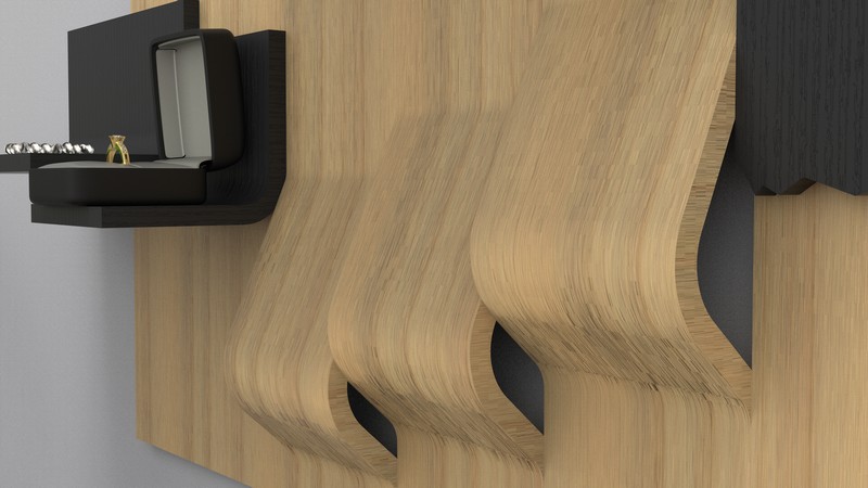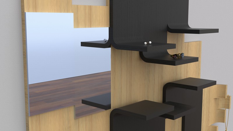 Dieses Projekt entstand aus der Kombination der Begriffe FUSION und ALTERATION. Auf diesem Schmuckständer soll zeitgenössischer Schmuck präsentiert werden. Die Module auf denen der Schmuck abgestellt oder angehängt wird bestehen aus Mooreiche und Ahornholz. Zwei Spiegel aus Plexiglas befinden sich oben Links des Möbelstücks. Der Schmuckständer wurde dafür entworfen, um an einer vertikalen Fläche befestigt zu werden wie zum Beispiel auf die Wand im Badezimmer.
