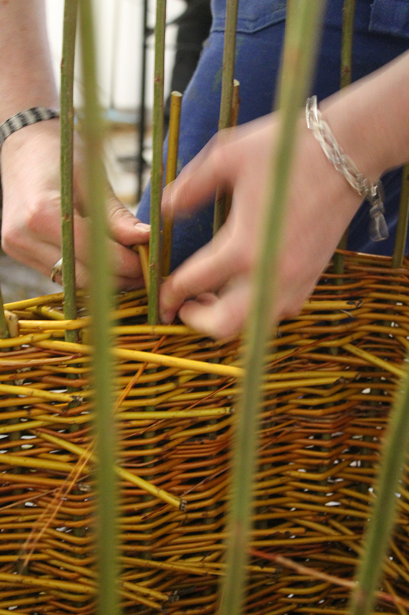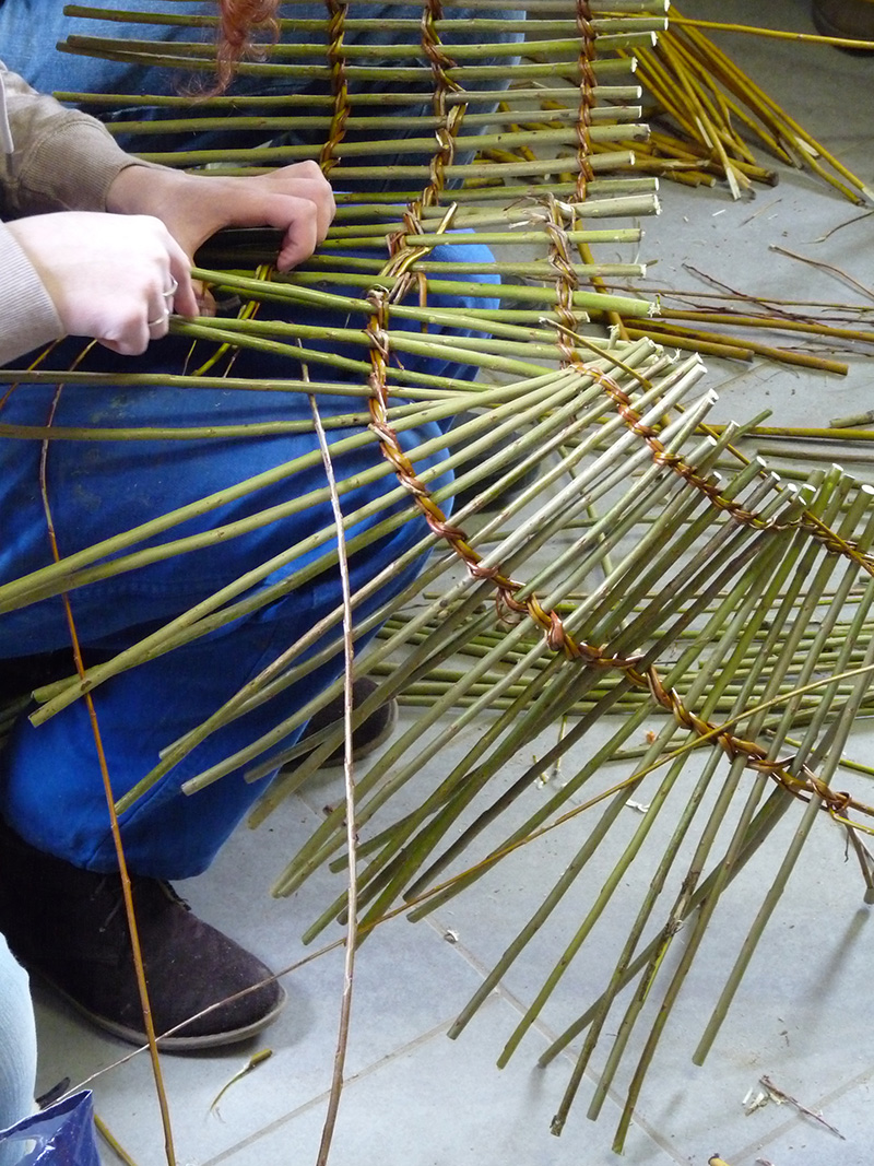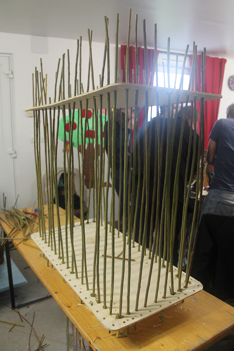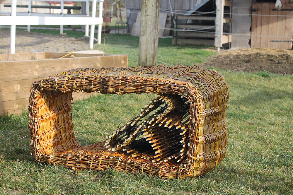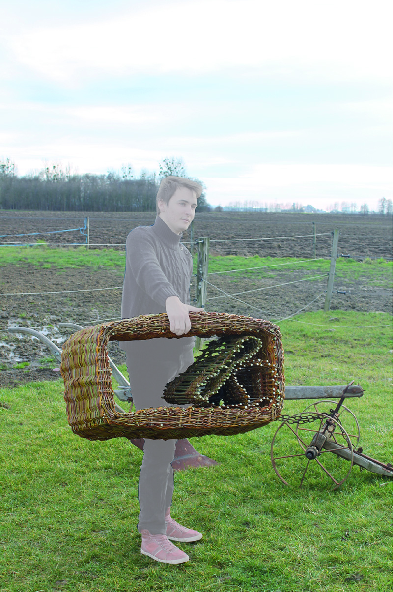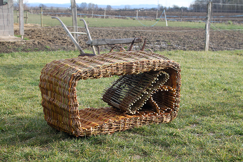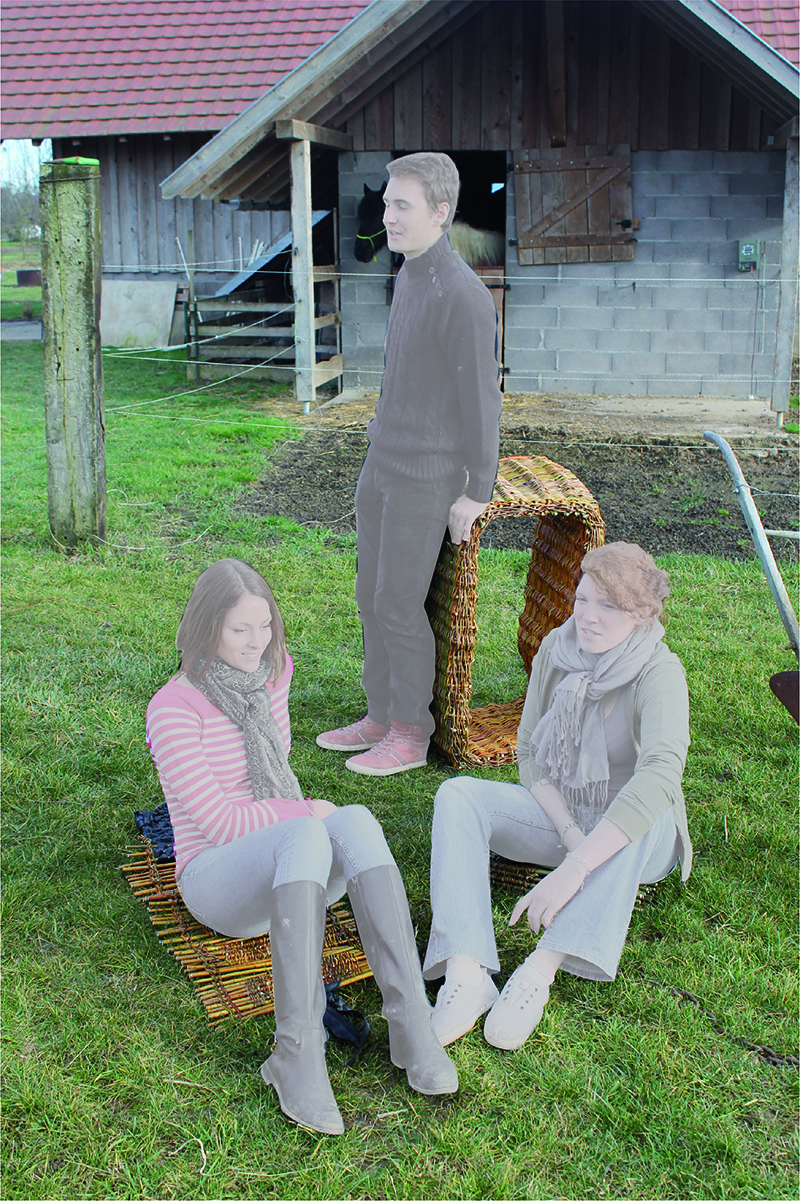 Nach einer Einführung von Flechten mit frischer Weide, wurden in Teamarbeit mit Marine CAUGANT, Kissen für Kinder (3-7 Jahre) aus diesem Material hergestellt. Diese Sitzmöglichkeiten wurden so gestaltet, dass sie in einem Bauernhof Setup für den Außenbereich benutzt werden können. Eine Korbstruktur ermöglicht eine Verstauung dieser geflochtenen Weidekissen. Die Kissen wurden mit wiederverwertendem Gummi kombiniert, um ein angenehmeres Sitzen zu ermöglichen.