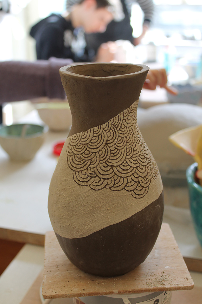 Grès foncé, barbotine, engobe.