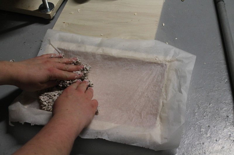 Contreplaqué, carton gris, carton brun, copeaux de bois, colle de caséine.