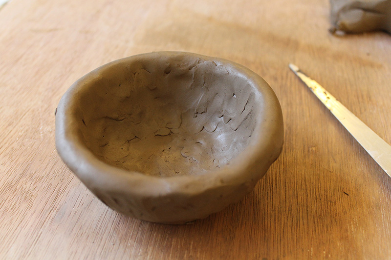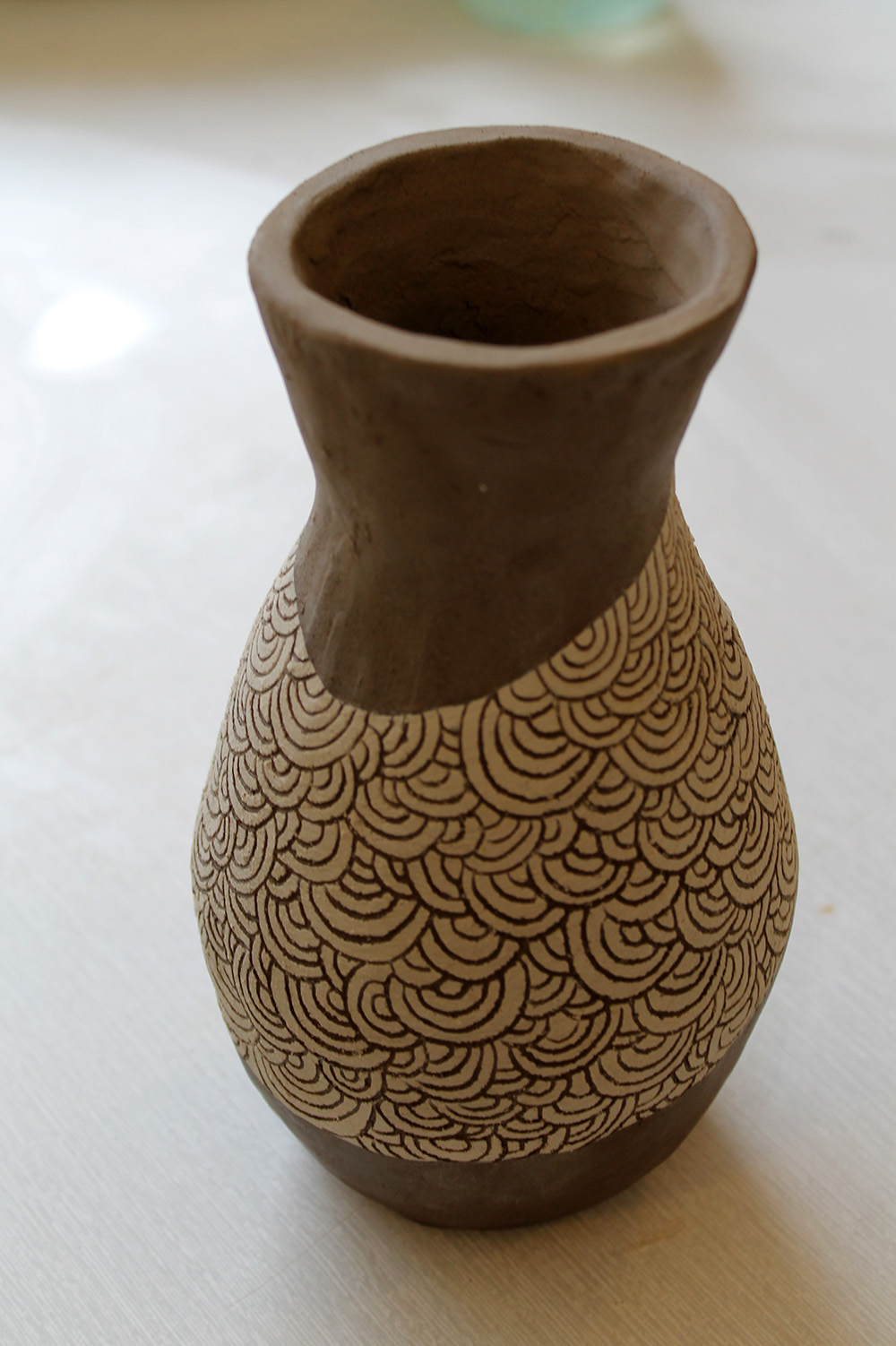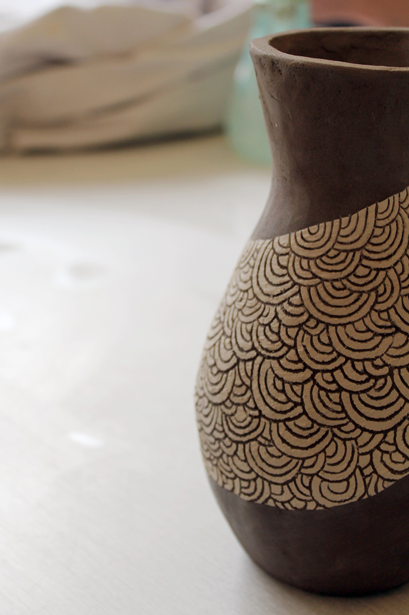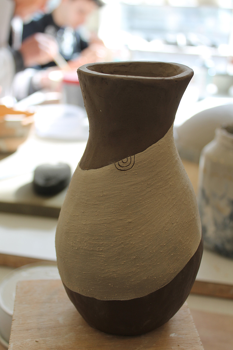 This vase was modelled with dark clay and by using the clay-coil technique. After drying the dark clay, a light-coloured slip was applied to the of the vase body with a brush. To create a contrast between the two-tone colours of clay, I engraved a wave pattern onto the light-coloured surface with a fine tip.