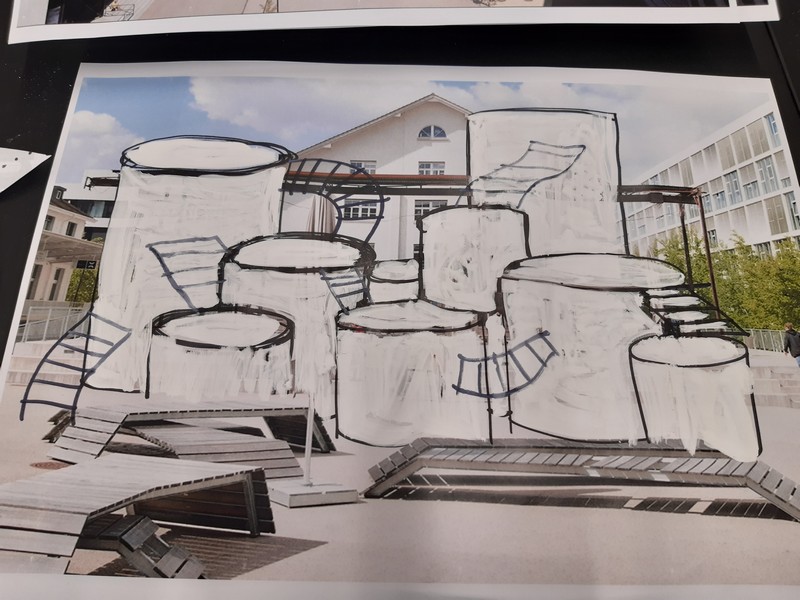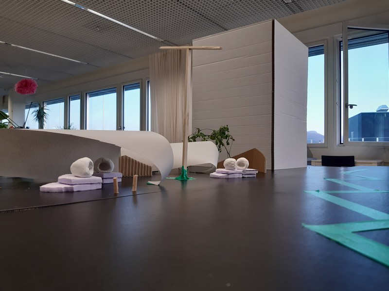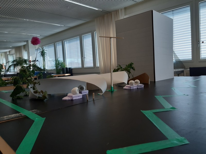+ Space takes place at the Freilager-Platz situated in Münchenstein in Switzerland, next to the FHNW HGK university. Due to the large and bare area, we imagined that movable hubs/tents would be placed there similar to islands. +Space would sport sails for meteorological purposes (rain, sun) and grass to bring nature to the industrial area. Students and workers would be able to use electricity and Wi-Fi via the school. We imagined that the hubs could be rented for art exhibitions, co-working or parties to create social networks.