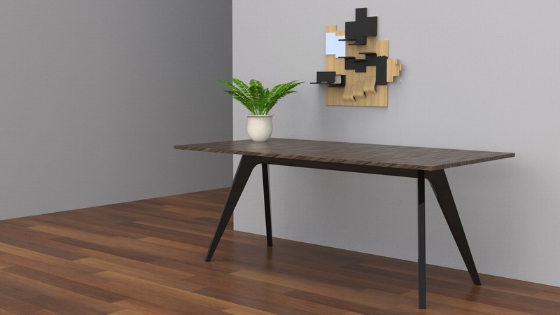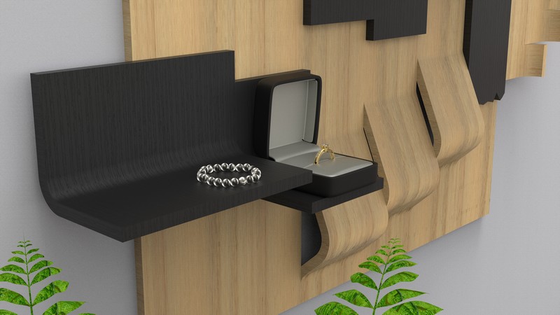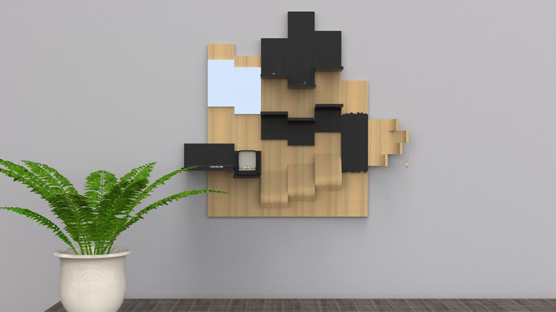 This project originated from a combination of the words fusion and alteration. This jewelry display has been designed in order highlight contemporary jewellery. The modules on which the jewellery is placed or suspended are made of swamp oak and maple wood. Two plexiglass mirrors are situated at the top left of this piece of furniture. The jewellery stand was designed to be mounted on a vertical surface such as the bathroom wall.