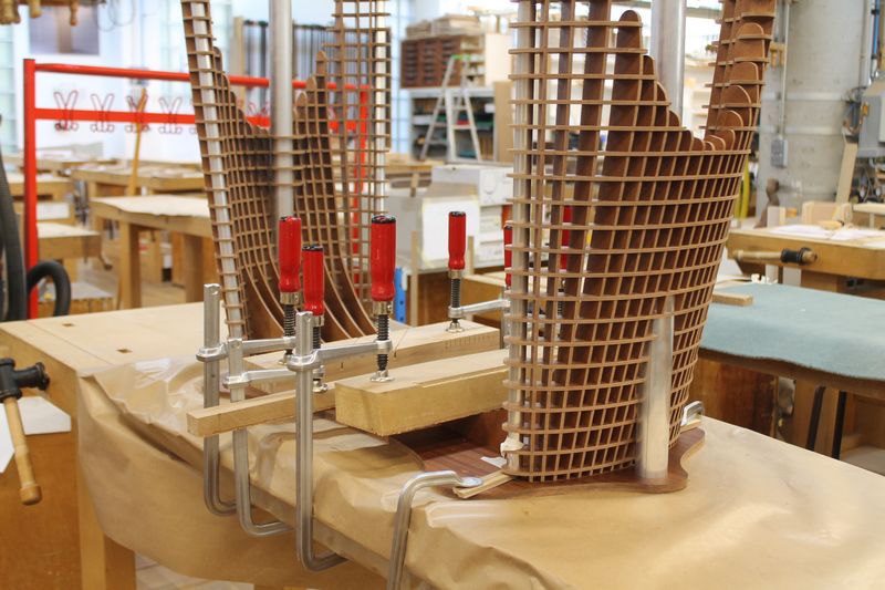 The half-joint assembly of the Sapelli veneer plywood legs is inspired from the construction technique of boats. This means that the frame is at the same time robust and light.
